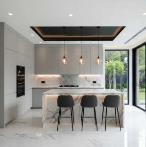 Untuk rumah minimalis, pilih finishing matte atau putih. Sedangkan rumah modern industrial cocok dengan warna hitam atau metalik. Jika ingin kesan elegan, aluminium glossy dengan aksen kaca transparan bisa menjadi pilihan tepat. Misalnya, dapur bergaya Scandinavian akan terlihat serasi dengan kitchen set putih matte yang sederhana namun stylish. Sementara rumah bergaya kontemporer bisa tampil lebih berkarakter dengan frame hitam yang dipadukan kaca buram. Penyesuaian finishing ini membuat kitchen set lebih menyatu dengan konsep interior secara keseluruhan. - Pilih Material Mudah Dirawat